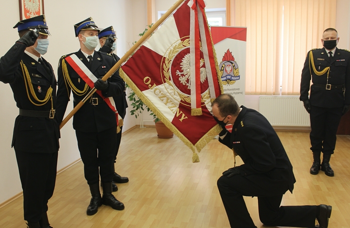 Nowy komendant st. kpt. Rafał Balcer w siedzibie komendy powiatowej PSP w Wyszkowie przywitał się ze sztandarem, służbą i funkcjonariuszami. W związku z aktualnymi obostrzeniami związanymi z pandemią COVID-19 w uroczystej zbiórce udział wzięli nieliczni goście: starosta Jerzy Żukowski, przewodniczący Rady Powiatu Waldemar Sobczak, komendant powiatowy Policji w Wyszkowie nadkom. Mariusz Sycik.