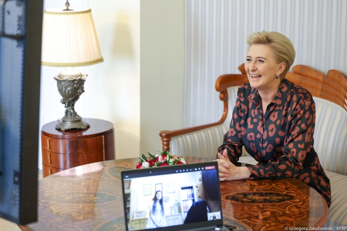 Pierwsza Dama rozmawiała online z dyrektor ośrodka, a do spotkania dołączyła nastoletnia Wiktoria Szulkowska, którą Prezydentowa poznała podczas spotkania w Pałacu Prezydenckim w 2015 roku. Ta wyjątkowa młoda artystka, u której zdiagnozowano autyzm, zaprezentowała tu wówczas swoje prace. Portret, który wykonała przed kilkoma laty do dziś zdobi galerię Małżonki Prezydenta.