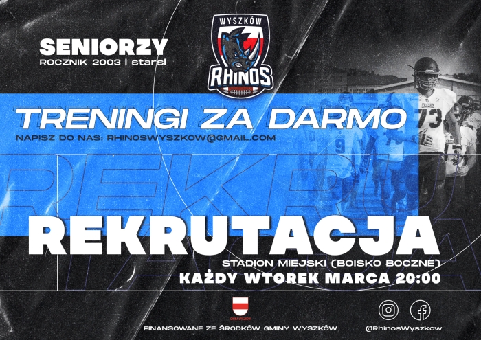(Zam: 24.02.2021 r., godz. 09.50)Treningi to szansa na poznanie futbolu amerykańskiego, sprawdzenie swoich możliwości, a także dołączenie do zespołu seniorów. Wystarczy mieć ukończone 18 lat, by móc uczestniczyć. Treningi w każdy wtorek marca rozpoczynają się o godz. 20.00. „Mamy niewielkie wymagania, a możemy zaoferować naprawdę dużo. Zastanawiasz się czy jesteś gotowy? Przyjdź i spróbuj!” - zachęcają Rhinos Wyszków.