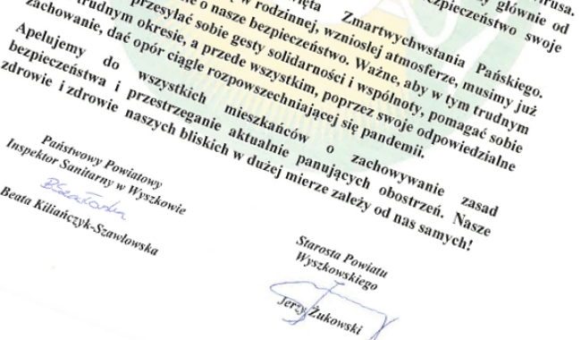 Za kilka tygodni czekają nas święta Zmartwychwstania Pańskiego. By święta te mogły odbyć się w rodzinnej, wzniosłej atmosferze, musimy już dzisiaj zadbać wspólnie o nasze bezpieczeństwo. Ważne, aby w tym trudnym dla nas czasie przesyłać sobie gesty solidarności i wspólnoty, pomagać sobie w tym trudnym okresie, a przede wszystkim, poprzez swoje odpowiedzialne zachowanie, dać opór ciągle rozpowszechniającej się pandemii.