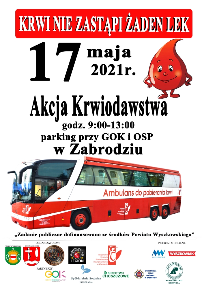 (Zam: 12.05.2021 r., godz. 09.33)Założona w ubiegłym roku Porębska Kropelka zaprasza na kolejną akcję pod hasłem „Krwi nie zastąpi żaden lek”. Tym razem finansowo wspiera ją powiat wyszkowski. Nie brak społeczników, którzy po raz kolejny zaangażowali się przedsięwzięcie (krwiobus był w Zabrodziu w grudniu 2020 r.).