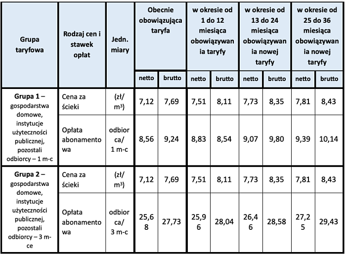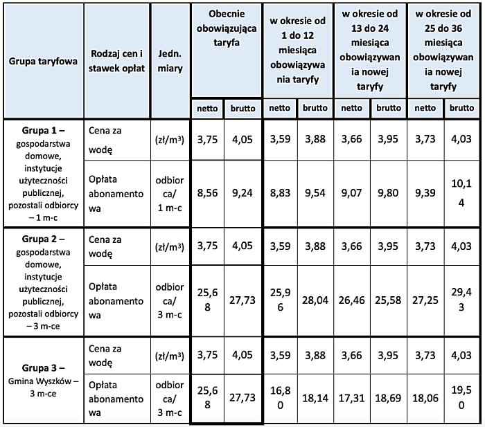 (Zam: 21.06.2021 r., godz. 11.46)W związku z końcem obowiązywania obecnej taryfy Przedsiębiorstwo Wodociągów i Kanalizacji w Wyszkowie złożyło nowy wniosek taryfowy do dyrektora Regionalnego Zarządu Gospodarki Wodnej w Warszawie. PWiK zostało zobowiązane do wyodrębnienia nowych grup taryfowych odbiorców na podstawie charakterystyki zużycia wody oraz ze względu na okres rozliczeniowy. Cena za wodę została obniżona, a cena za ścieki uległa wzrostowi (zgodnie z poniższą tabelą).