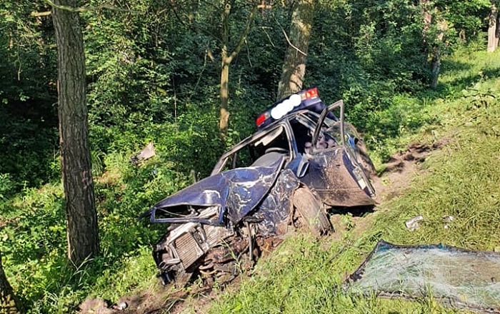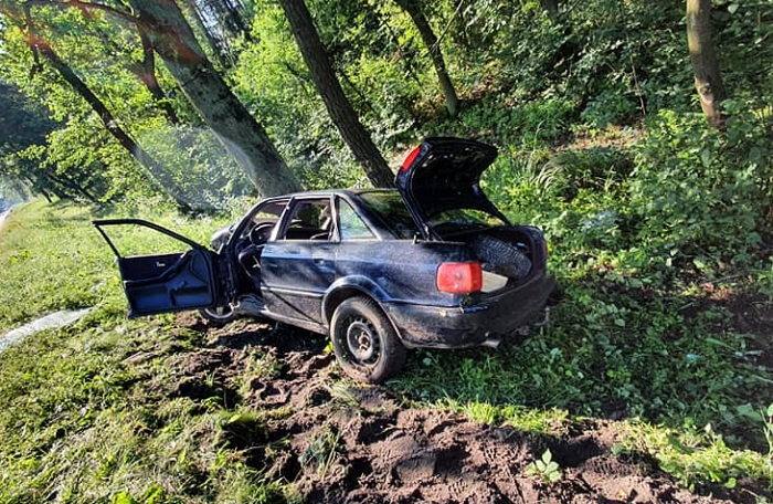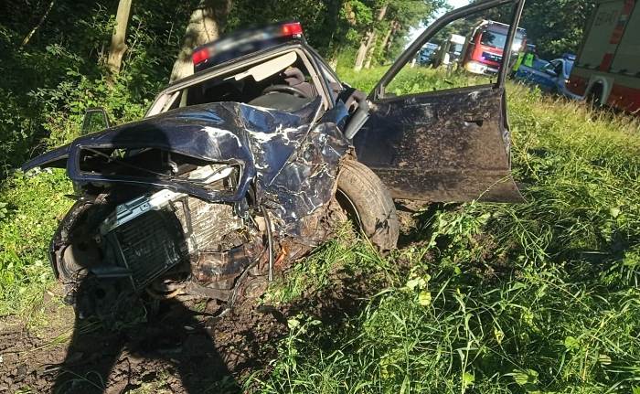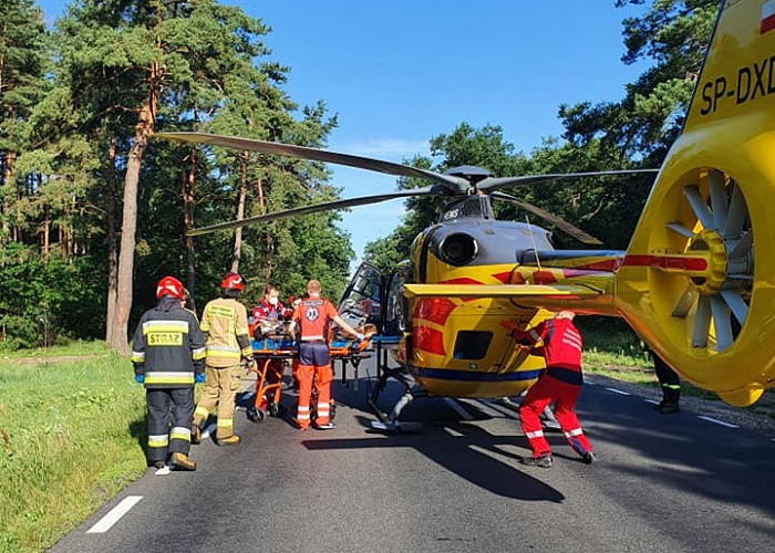Samochód osobowy zjechał z jezdni do rowu i uderzył w drzewo. Podróżowało nim trzech mężczyzn. Akcja trwała prawie 2 godziny i brało w niej udział 20 strażaków. Ich działania polegały na zabezpieczeniu miejsca zdarzenia, udzieleniu kwalifikowanej pierwszej pomocy jednemu z poszkodowanych oraz pomocy Zespołom Ratownictwa Medycznego. Strażacy zabezpieczali miejsce lądowania dla Lotnicze Pogotowie Ratunkowe.