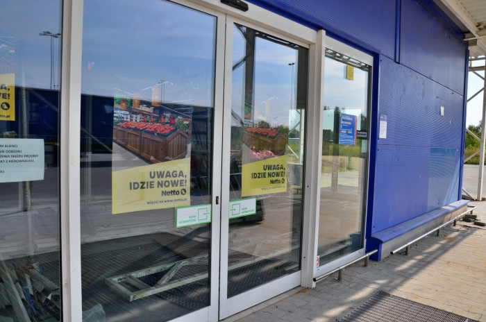 W drzwiach wejściowych do dotychczasowego Tesco na plakatach możemy przeczytać komunikat „Uwaga, idzie nowe!” z zaproszeniem do odwiedzenia strony internetowej netto.