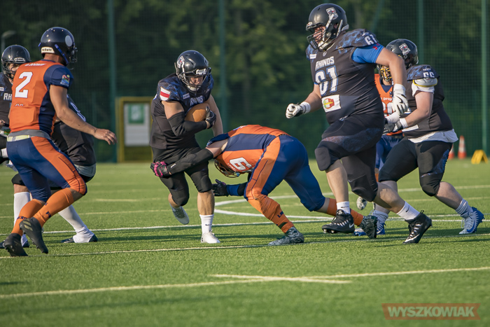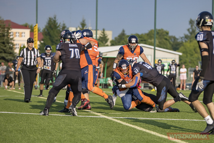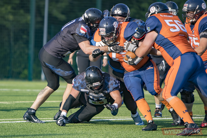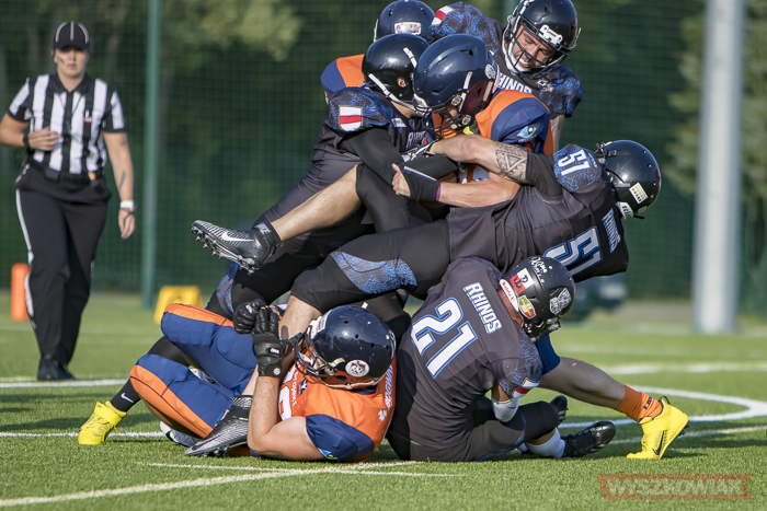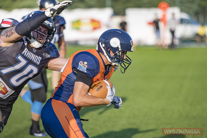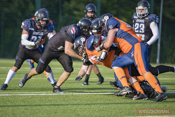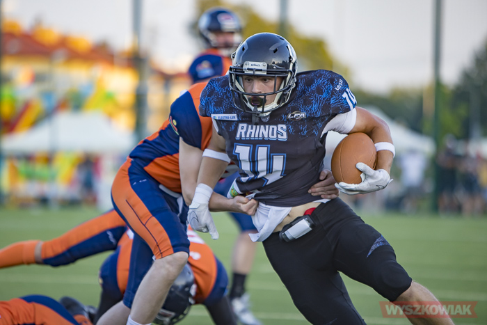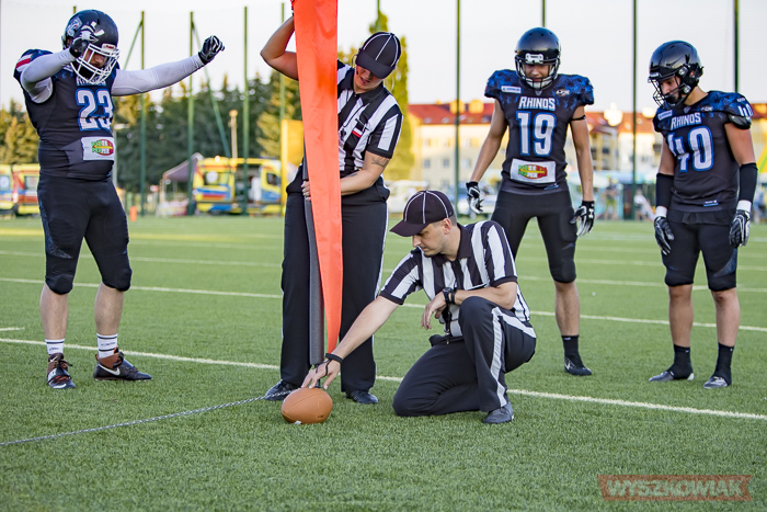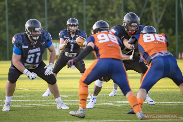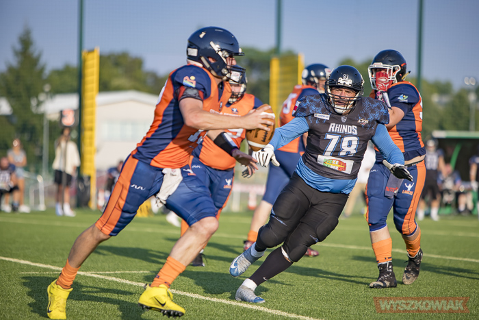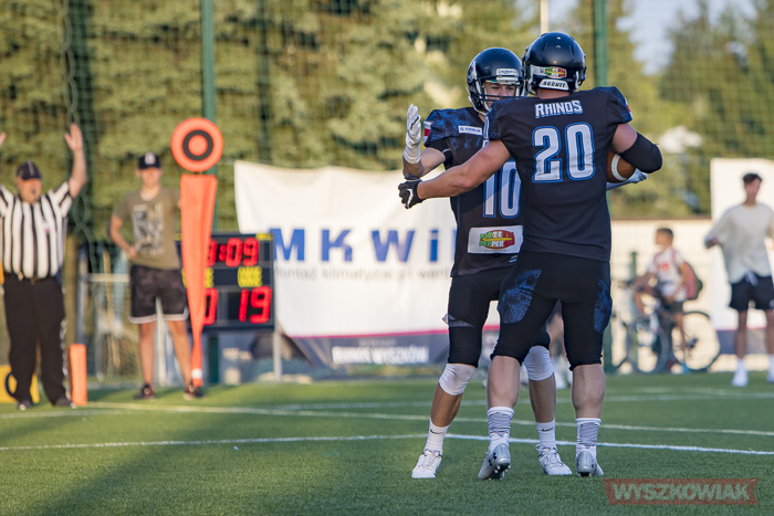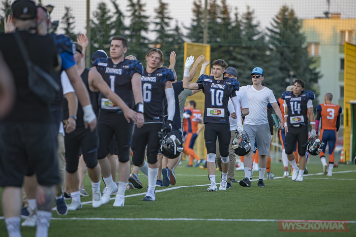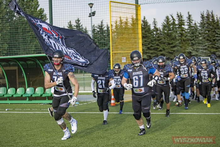 (Zam: 17.08.2021 r., godz. 10.22)Mecz został rozegrany w sobotę 14 sierpnia na stadionie WOSiR w Wyszkowie. Olsztyn Lakers to tradycyjny już rywal Rhinos na inaugurację sezonu. Nieznacznym faworytem meczu byli goście, którzy w ostatnich sezonach osiągają lepsze wyniki. Wyszkowianie nie zamierzali jednak oddać spotkania bez walki, szczególnie na swoim terenie. Goście ze stolicy Warmii potwierdzili swoją siłę już w pierwszej połowie meczu. Mimo bardzo ofiarnej gry wyszkowskiej defensywy, olsztynianie zanotowali dwa przyłożenia. Formacja ofensywna Rhinos była z kolei bezradna i ta sytuacja utrzymała się do ostatniej kwarty spotkania, w której Rhinos w końcu zapunktowali. Było to jednak za mało do zwycięstwa – Olsztynianie zdobyli w tym meczu cztery touchdowny, wygrywając 26:6.