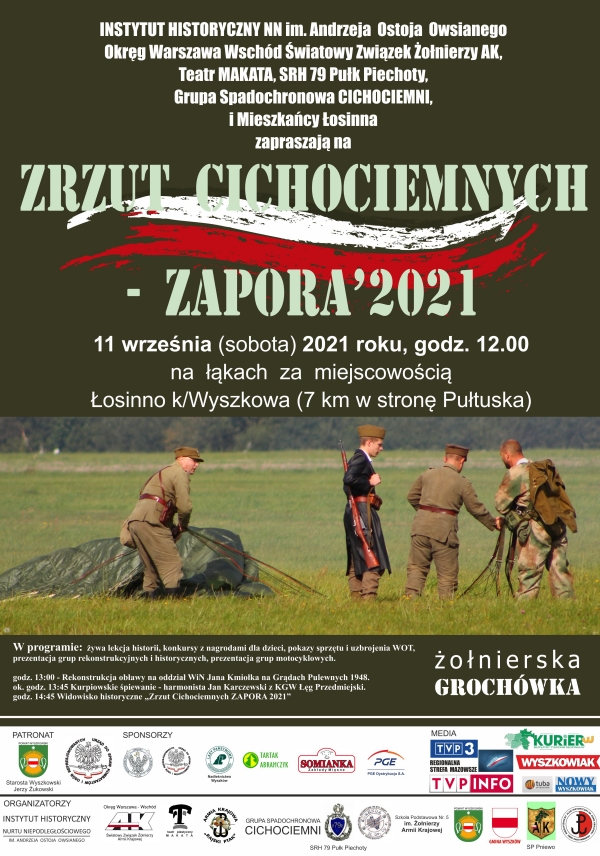 Zapraszają: Instytut Historyczny NN im. Andrzeja Ostoja Owsianego, Okręg Warszawa Wschód Światowego Związku Żołnierzy Armii Krajowej, Teatr Makata, Stowarzyszenie Rekonstrukcji Historycznej 79 Pułk Piechoty, Grupa Spadochronowa Cichociemni, mieszkańcy Łosinna.