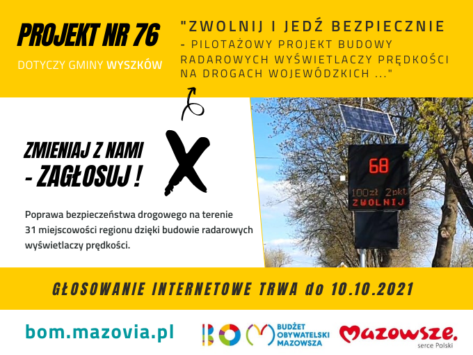 Aby wziąć udział w głosowaniu należy wejść na stronę www.bom.mazovia.pl, następnie przejść do zakładki „głosuj” i podać swoje dane. System przekieruje do listy projektów. Wnioskowi samorządów przypisany został numer 76 i nazwa „Zwolnij i jedź bezpiecznie – pilotażowy projekt budowy radarowych wyświetlaczy prędkości na drogach wojewódzkich na terenie gmin Brwinów, Głowaczów, Grodzisk Mazowiecki, Jasieniec, Józefów, Nadarzyn, Nowa Sucha, Osieck, Miasto Płońsk, Pruszków, Raszyn, Sanniki, Sierpc, Sochaczew, Sokołów Podlaski, Miasto Sokołów Podlaski, Tarczyn, Warka, Węgrów i Wyszków”.