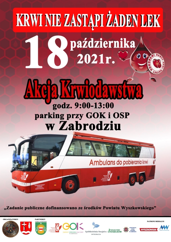 (Zam: 13.10.2021 r., godz. 11.04)To już kolejna tego typu inicjatywa w tym roku, która organizuje Porębska Kropelka Oddział Klubu HDK Legion. Wspiera ją finansowo powiat wyszkowski. W organizację zaangażowani są także: gmina Zabrodzie, sołectwo Choszczowe, spółdzielnia Socjalna „Integracja”, Gminny Ośrodek Kultury, Regionalne Centrum Krwiodawstwa i Krwiolecznictwa w Warszawie, Ochotnicza Straż Pożarna w Zabrodziu.