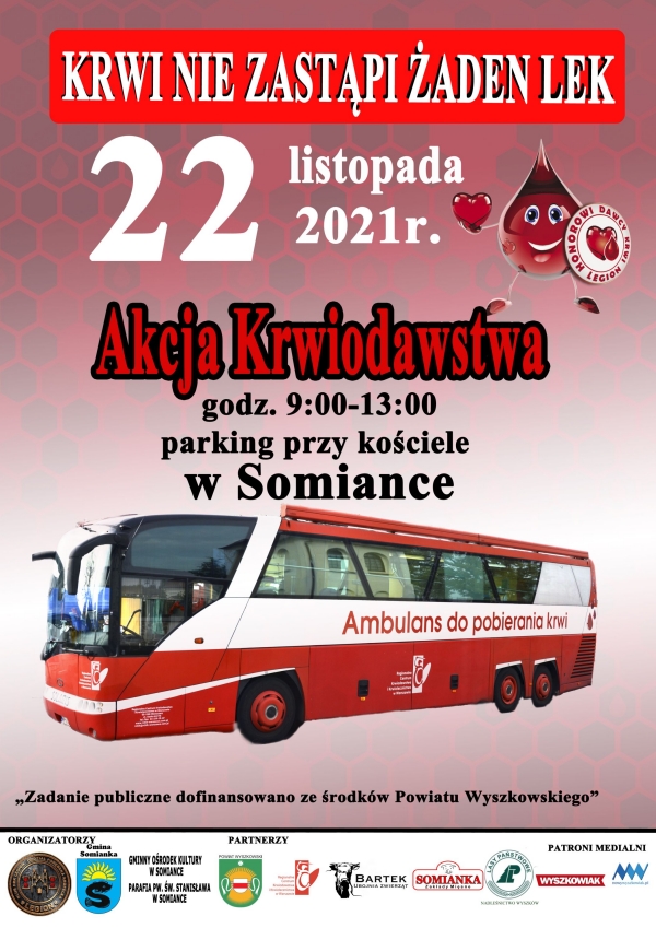 (Zam: 09.11.2021 r., godz. 14.42)To już kolejna tego typu inicjatywa w tym roku. Porębska Kropelka zaprasza wraz z gminą Somianka, Gminnym Ośrodkiem Kultury w Somiance, parafią pw. św. Stanisława BM w Barcicach z siedzibą w Somiance. Akcję wspiera powiat wyszkowski, Zakłady Mięsne „Somianka”, Ubojnia „Bartek”, Nadleśnictwo Wyszków.