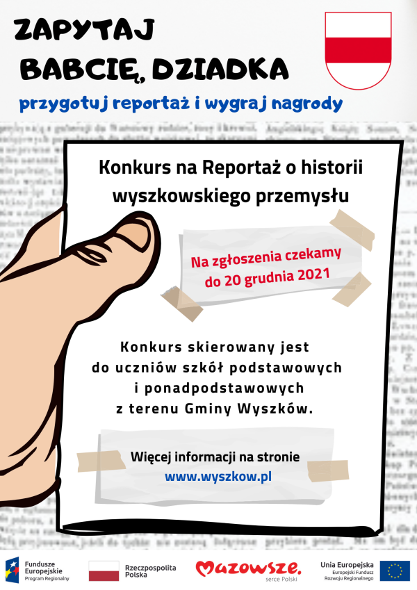 (Zam: 19.11.2021 r., godz. 12.49)Konkurs na reportaż dla uczniów szkół podstawowych i ponadpodstawowych z gminy Wyszków ma popularyzować wiedzę o historii wyszkowskiego przemysłu. Organizuje go Urząd Miejski. Prace tworzone indywidualnie lub w zespołach 2-3-osobowych (tekst i zdjęcia) należy przesyłać do 20 grudnia na adres promocja@wyszkow.pl lub na adres pocztowy Urzędu Miejskiego (aleja Róż 2, 07-200 Wyszków z dopiskiem „Reportaż - wyszkowski przemysł”). Do wygrania tablet, aparat cyfrowy, smartwatch. Informacje na temat konkursu pod nr tel. 29 743 77 13, e-mail: promocja@wyszkow.pl. Regulamin, karta zgłoszeniowa na wyszkow.pl