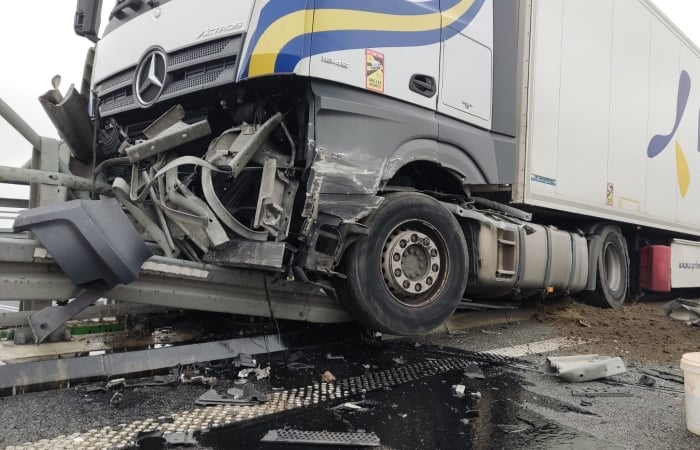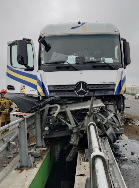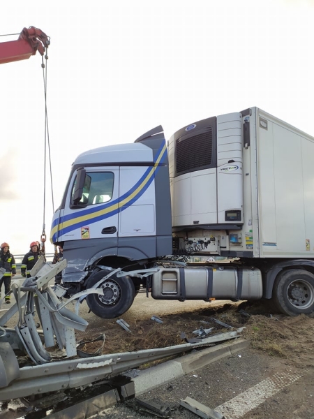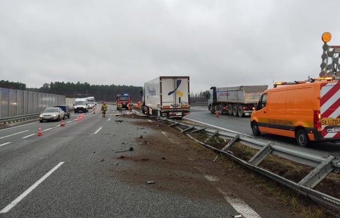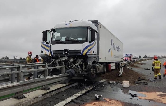 Samochód ciężarowy z naczepą najechał na barierki oddzielające pasy ruchu. Nikt nie został ranny. Działania straży polegały na zabezpieczeniu miejsca zdarzenia oraz postawieniu pojazdu na jezdni, tak aby możliwe było jego odholowanie. Na miejsce została zadysponowana Specjalistyczna Grupa Ratownictwa Technicznego z Komendy Miejskiej PSP w Warszawie.