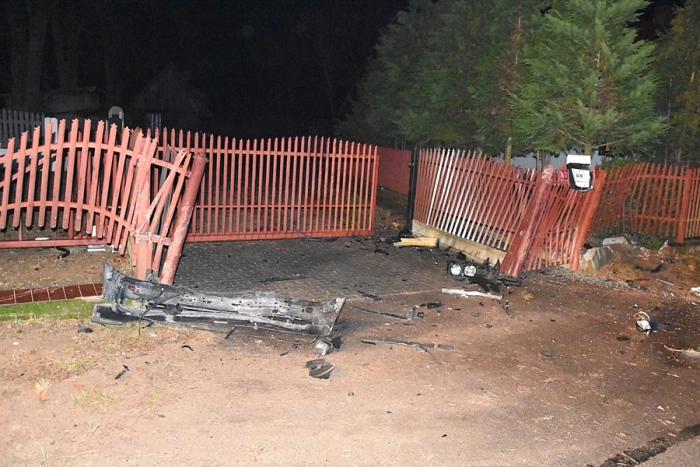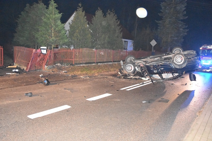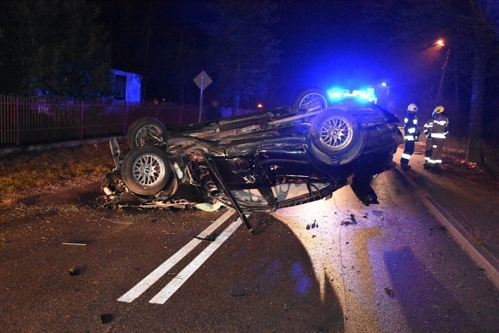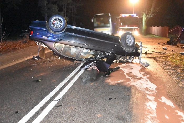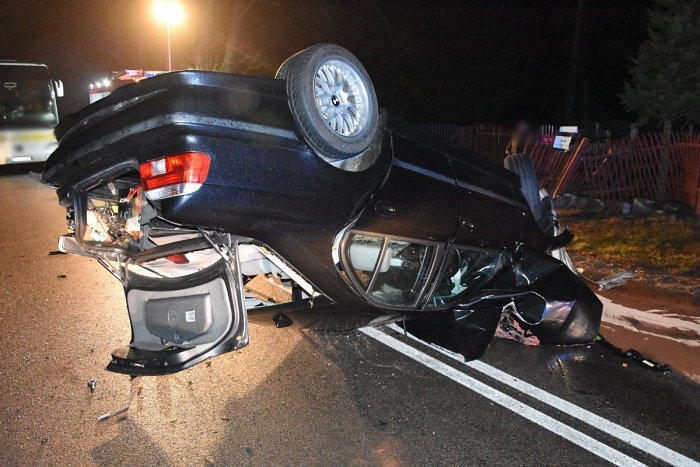 (Zam: 24.11.2021 r., godz. 11.33)Do wypadku doszło we wtorek 23 listopada o godz. 23.30 na drodze powiatowej w Białymbłocie-Kobylej, na której obowiązuje ograniczenie prędkości do 50 km/h. Według wyszkowskiej Policji, 21-letni kierowca BMW jadąc od strony Długosiodła zauważył sarnę, która wbiegła na drogę. Chcąc uniknąć zderzenia ze zwierzęciem mieszkaniec gminy Wyszków gwałtownie zahamował i skręcił kierownicą. Stracił panowanie nad BMW, zjechał na przeciwległy pas ruchu i uderzył w ogrodzenie pobliskiej posesji. Po uderzeniu w płot auto 21-latka dachowało i zatrzymało się na środku jezdni.