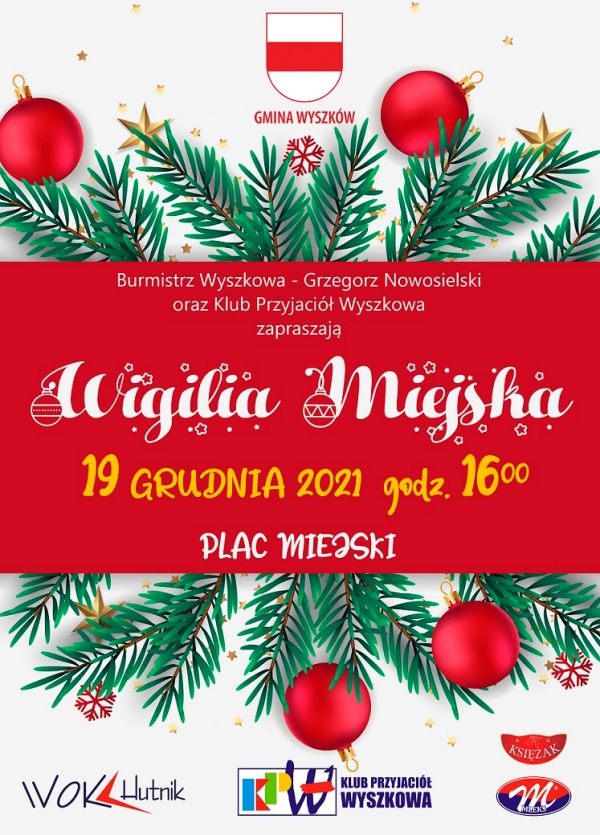 (Zam: 14.12.2021 r., godz. 14.08)Dodatkowo 19 grudnia o godz. 16.00 na placu Miejskim gmina Wyszków oraz Klub Przyjaciół Wyszkowa organizują Wigilię Miejską. Zapraszają mieszkańców do wspólnego kolędowania.
