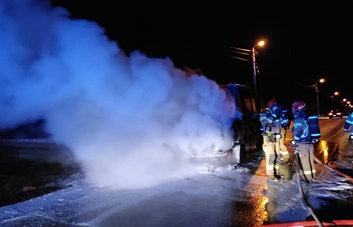 (Zam: 24.01.2022 r., godz. 07.49)W chwili przyjazdu straży pożar był już rozwinięty i obejmował cały pojazd. Kierowca znajdował się na zewnątrz i nie wymagał udzielenia pomocy medycznej. Akcję utrudniał fakt, że w przedziale ładunkowym był zbiornik z olejem napędowym, który wskutek pożaru rozszczelnił się, co w konsekwencji doprowadziło do zapalenia się rozlanej cieczy.