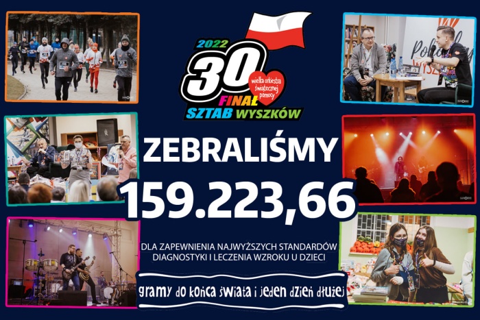 (Zam: 31.01.2022 r., godz. 18.39)W ubiegłym roku zakończyła się ona kwotą 148 758,05 zł. Podczas jubileuszowego finału, mimo niesprzyjającej pogody, zebrano więcej o ponad 10,5 tys. zł. „To nie był łatwy czas dla naszego sztabu, a zadyma była konkretna. Przez wiele przeszkód musieliśmy szybko podejmować trudne decyzje, ponosić ogromną odpowiedzialność, a wolontariusze kwestowali w okropnych warunkach atmosferycznych, ale udało się. Dzięki Waszemu wsparciu, otwartych sercach i umysłach, ogromu pracy wielu instytucji i osób po raz kolejny wygraliśmy!” - podsumowuje wyszkowski sztab.