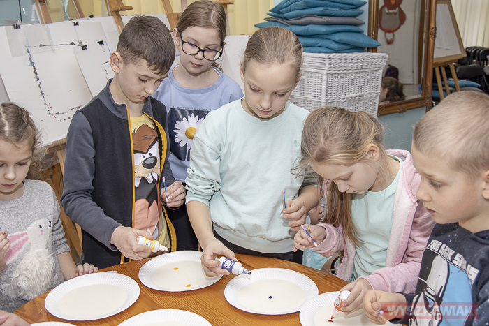 Na budowaniu fabryki minęła pierwsza godzina zajęć. Następnie przyszedł czas na tworzenie kolorowych kompozycji przy użyciu barwnika, płynu do naczyń, mleka. Połączenie tych składników pozwoliło na zabawę fantazyjnymi wzorami powstającymi na talerzykach.