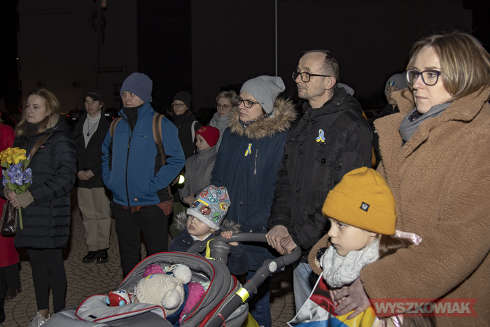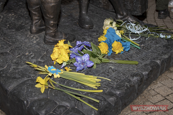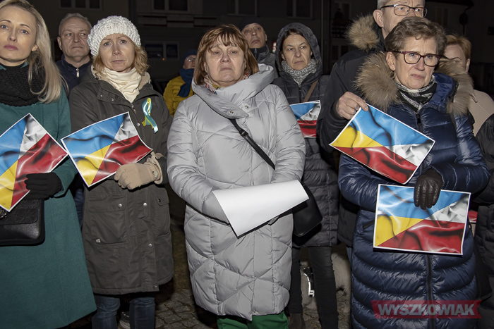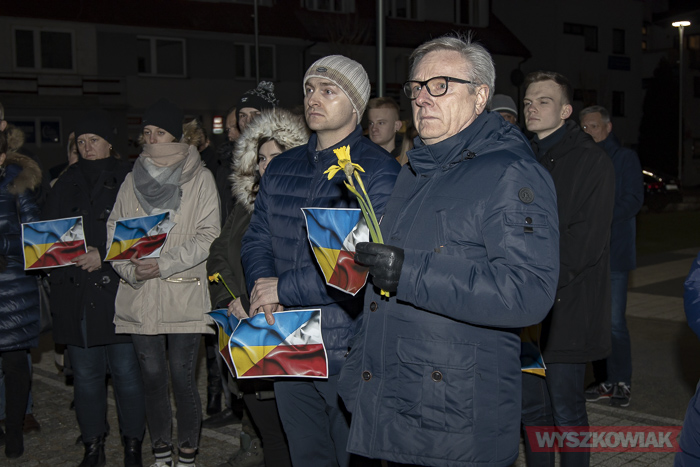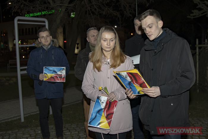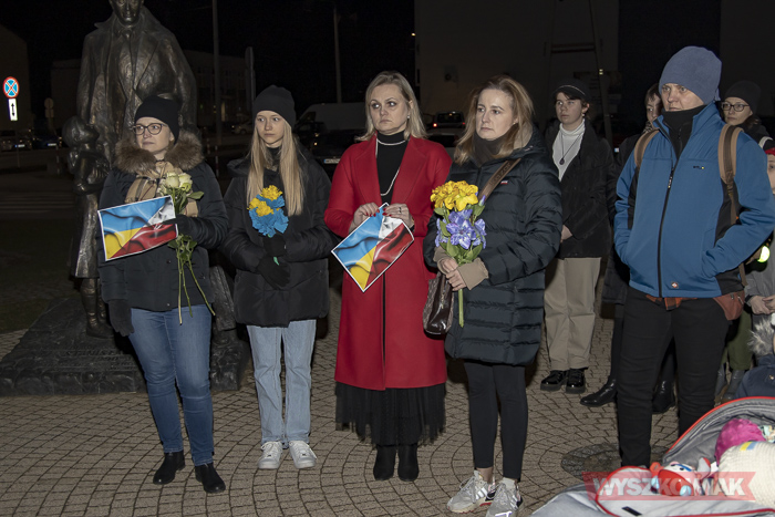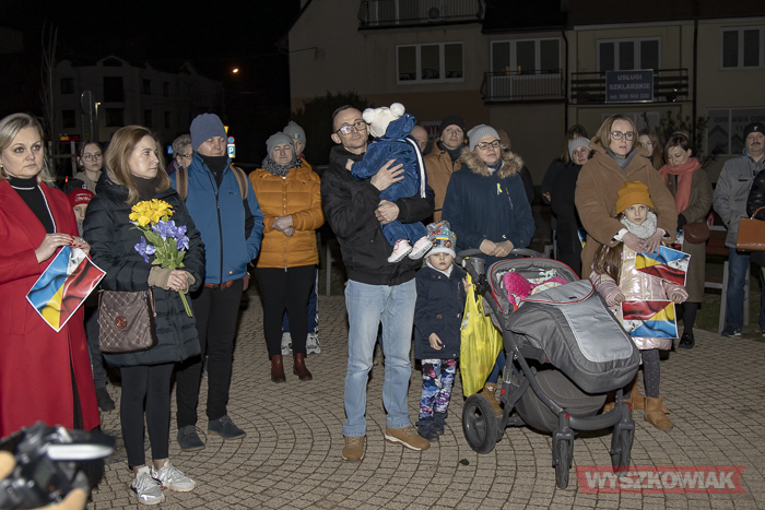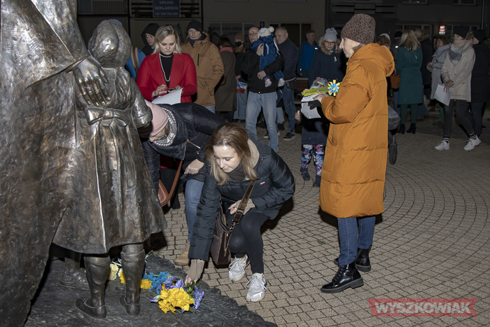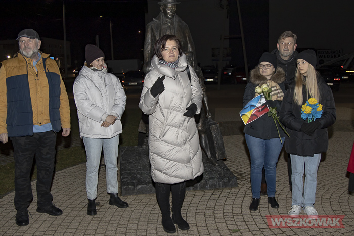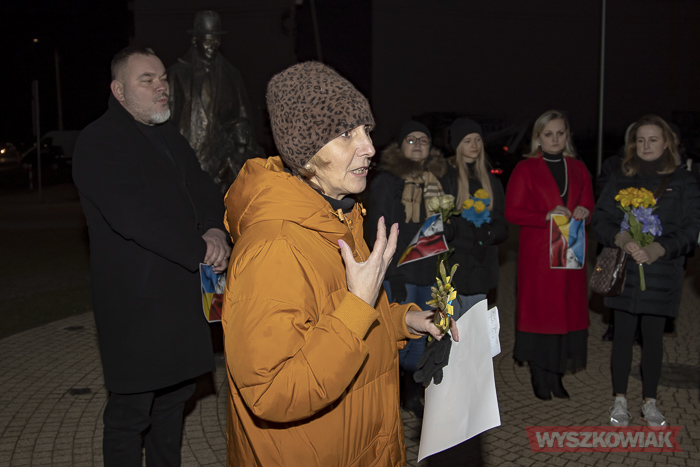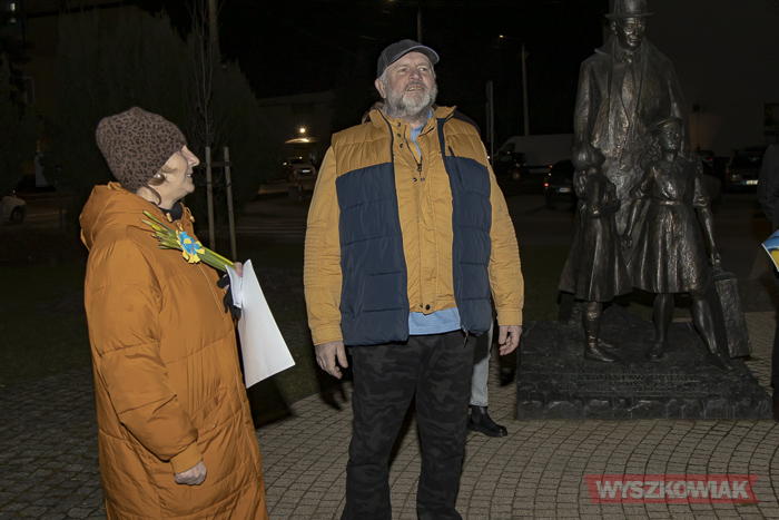 - Kiedy w 2018 r odsłanialiśmy ten pomnik była tu kobieta, która opowiadała, jak burmistrz w czasie wojny uratował dwie dziewczynki. Nie wyobrażaliśmy sobie w 2018 r., że wojenna rzeczywistość może nas spotkać - zabrała głos Elżbieta Piórkowska. - Jako nauczyciel 1 września zawsze mówię o Westerplatte i o polskich dzieciach, które 1 września nie poszły do szkoły. Mówię swoim wychowankom „cieszmy się, bo dziś jesteśmy w szkole”. A wczoraj usłyszałam słowa jednego z rosyjskich muzyków, że kiedy prowadził swoje dziecko do szkoły miał łzy w oczach, bo pomyślał o swoich przyjaciołach na Ukrainie. Ich dzieci nie poszły rano do szkoły - dodała. - Dziś przyszliśmy pod pomnik bardzo szlachetnego człowieka, który ratował żydowskie dzieci, przyszliśmy wykrzyczeć, ale nie krzykiem rozpaczy, ale głosem silnym, pomocnym „My tu jesteśmy, my wam pomożemy i wyciągamy dzisiaj dłoń do naszych sąsiadów”. Nie będą to tylko słowa, w Wyszkowie już zamieniają się w czyny. Szkoły organizują zbiórki, młodzi ludzie nam dorosłym dają przykład, że należy pomagać, otwierać swoje serca. Ukraina ma hymn podobny do naszego, gdzieś wyczytałam, że prawdopodobnie wzorowany na naszym. Śpiewają „Nie umarła jeszcze Ukraina”, a my odnosząc się do słów tego hymnu możemy powiedzieć - jeszcze do was, bracia Ukraińcy, uśmiechnie się los. Tego życzymy, jesteśmy z wami całym sercem. Prawdodpobnie już niedługo będą się otwierać przed Ukraińcami drzwi do naszych mieszkań, schronisk. Bądźmy dla nich otwarci, miejmy dla nich otwarte serca i oby nas taki los nie spotkał. Oni czują to nasze wsparcie, że jesteśmy z nimi. W nas siła, jesteśmy razem, jesteśmy z Ukrainą.