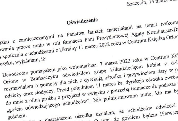(Zam: 14.03.2022 r., godz. 17.00)W związku z zamieszczanymi na Państwa łamach materiałami na temat rzekomego występowania przeze mnie w roli tłumacza Pani Prezydentowej Agaty Kornhauser-Dudy podczas spotkania z uchodźcami z Ukrainy 11 marca 2022 roku w Centrum Księdza Orione w Brańszczyku, wyjaśniam, iż: