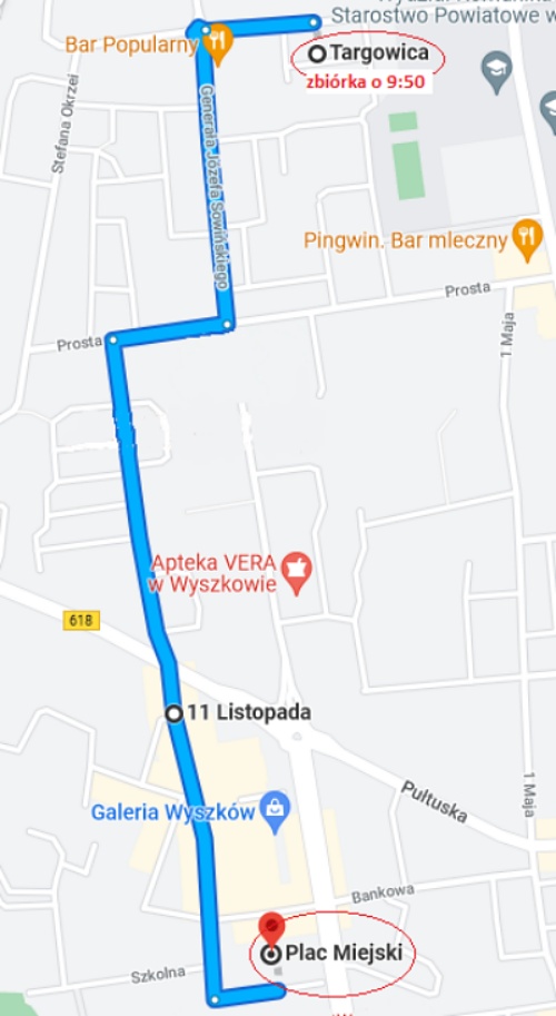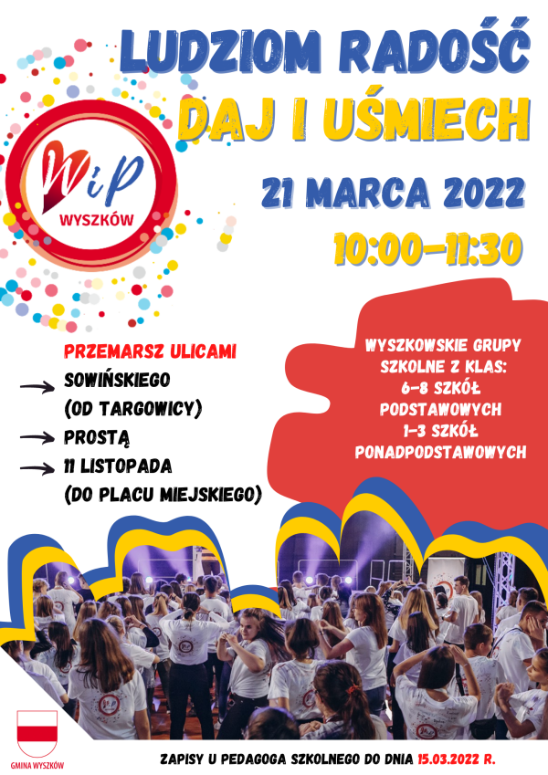 (Zam: 18.03.2022 r., godz. 12.20)Trasa: ul. Dworcowa od targowicy, ul. Sowińskiego, ul. Prosta, ul. 11 Listopada do placu Miejskiego (planowane utrudnienia w ruchu ulicznym w godz. 10.00-11.00). W wydarzeniu ma wziąć udział ok. 500 uczniów szkół podstawowych i ponadpodstawowych z gminy Wyszków. Ma ono charakter profilaktyczny i integrujący młodzież wobec aktualnych problemów. Uczniowie będą szli z przygotowanymi wcześniej banerami z hasłami, a na placu Miejskim zaplanowane są m.in. występ Młodzieżowej Orkiestry Dętej OSP w Wyszkowie, odtańczenie belgijki, odśpiewanie piosenki „Młodzież z Wyszkowa dla Ukrainy" przygotowanej przez Romana Grusa Studio RG i nagranej przez młodzież z MTP FARSA i Szkoły Podstawowej nr 5. Całość wydarzenia zabezpieczy Komenda Powiatowa Policji w Wyszkowie.