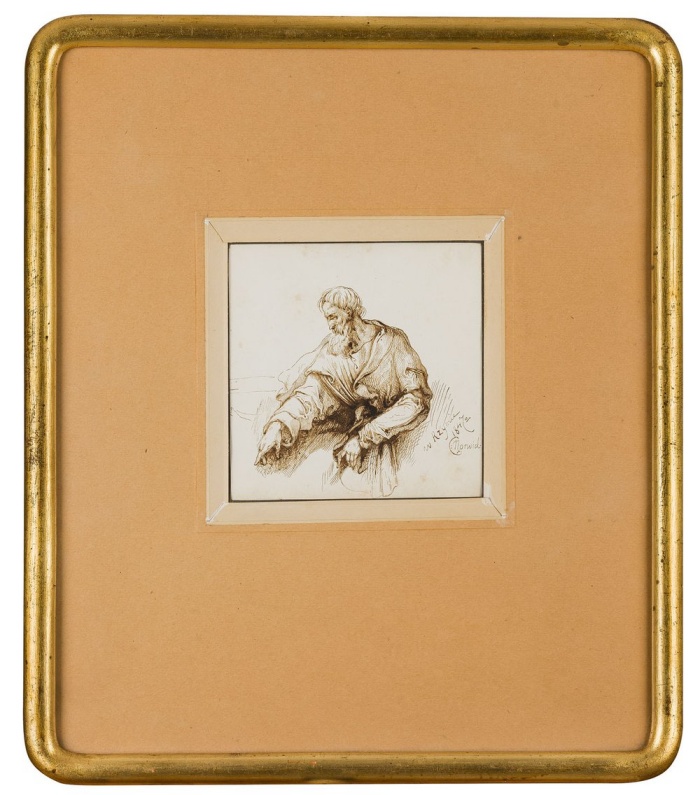 „Mężczyzna ubrany jest w antykizowaną, luźną szatę z szerokimi rękawami, obficie udrapowaną, z narzuconą na ramiona peleryną (płaszczem?). Wiele elementów rysunku – począwszy od tematu, poprzez charakterystykę przedstawionej postaci, kwestie warsztatowe, aż po sygnaturę wyraźnie wpisuje się w charakterystykę twórczości Norwida. Wydaje się, że mamy do czynienia nie tyle z portretem konkretnej postaci, co raczej z wizerunkiem o charakterze imaginacyjnym. Na korzyść tej ewentualności przemawia idealizacja rysów twarzy oraz swoiste uwznioślenie podobizny.” (z opisu zamieszczonego na stronie desa.pl).