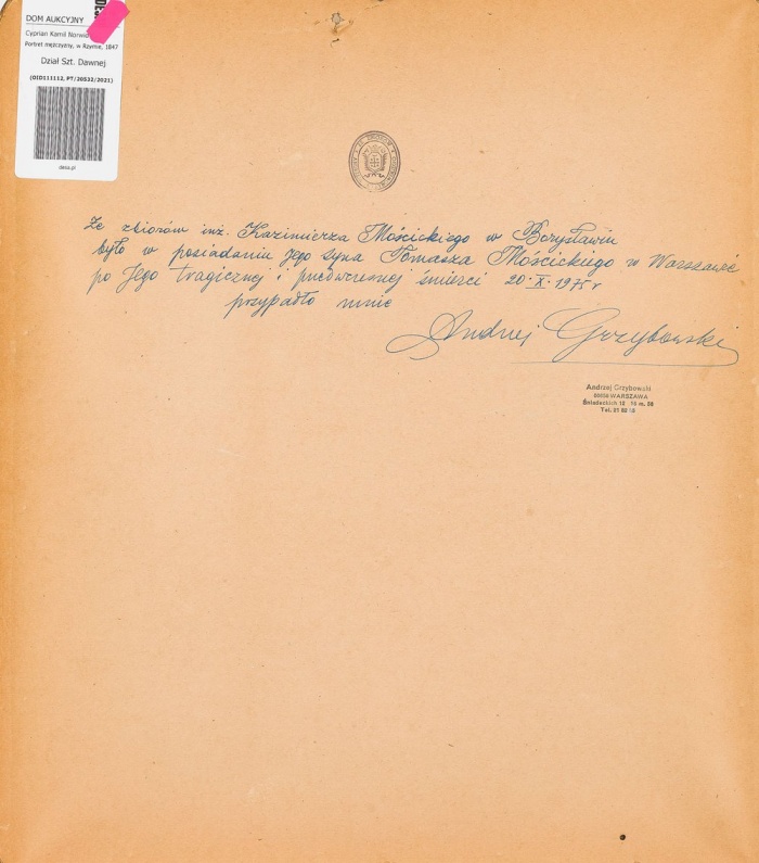 Na odwrocie rysunku znajdują się opisy spadkobierców inż. Kazimierza Mościckiego (z jego kolekcji pochodzi rysunek, opisy widoczne na zdjęciu). Do rysunku dołączono ekspertyzę dr Edyty Chlebowskiej, historyk sztuki, znawczyni dzieł plastycznych Cypriana Norwida, która w maju ubiegłego roku była gościem w Dębinkach i opowiadała o „Plastycznym Świecie Norwida”.