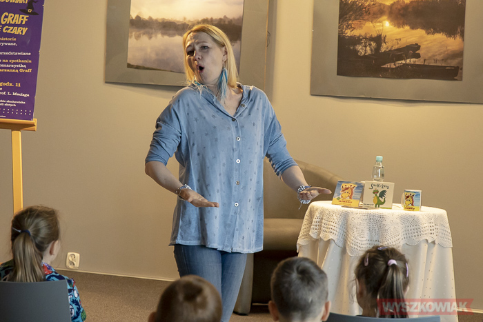(Zam: 22.04.2022 r., godz. 14.40)„Czary mary nie do wiary, czyli Marzanna Graff jej bajkowe czary” to tytuł spotkania, które odbyło się 22 kwietnia w sali im. prof. Ludwika Maciąga na III piętrze biblioteki. Aktorka zaprezentowała przedszkolakom ciekawe opowieści wciągając młodych słuchaczy w rozmowę o twórczości i bajkach. Marzanna Graff potrafi napisać bajkę czyniąc bohaterem dowolnie wybraną osobę. Takich opowieści powstało już ok. 200. Dzieci z niedowierzaniem przyjęły tę wiadomość, bo w końcu nie jest łatwo wymyślić nawet jedną ciekawą historię. Marzanna Graff zachęcała dzieci do własnej twórczości.
