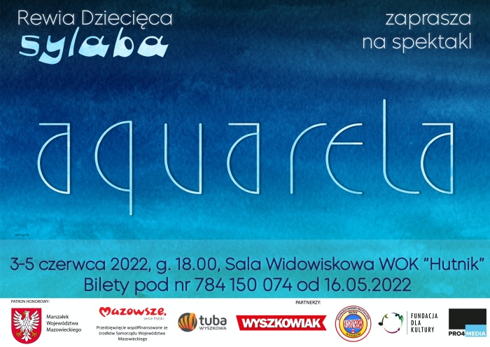 Zadanie publiczne „Aquarela - wydarzenie Rewii Dziecięcej Sylaba o naturze i roli wody w kulturze Mazowsza” objęto honorowym patronatem Marszałka Województwa Mazowieckiego oraz dofinansowano ze środków z budżetu Województwa Mazowieckiego.