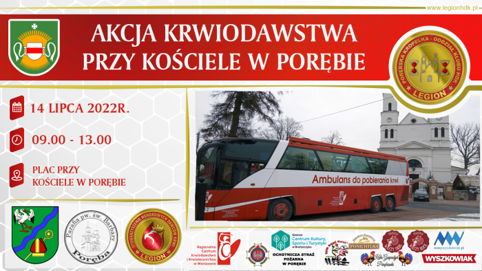 (Zam: 27.06.2022 r., godz. 09.56)Tym razem odbędzie się ona pod warunkiem, że wcześniej zgłosi się 30 chętnych do oddania krwi tego dnia. Kontakt z Porębską Kropelką: poreba@legionhdk.pl