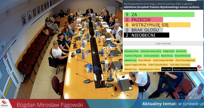 (Zam: 29.06.2022 r., godz. 20.36)Głosowanie nad wotum zaufania poprzedzone było przedstawieniem raportu o stanie powiatu wyszkowskiego za 2021 r. Za udzieleniem wotum zaufania głosowało 9 radnych: Ewa Bartosiewicz, Teresa Czajkowska, Paweł Deluga, Marzena Dyl, Bogusław Frąckiewicz. Justyna Garbarczyk, Renata Rębała, Waldemar Sobczak, Jerzy Żukowski. Wstrzymało się 8: Wojciech Kozon, Tadeusz Kuchta, Agnieszka Ołdak-Prokop, Bogdan Pągowski, Sławomir Pędzich, Adam Turek, Piotr Wykowski, Katarzyna Wysocka (nieobecni na sesji byli Adam Mróz i Iwona Wyszyńska).
