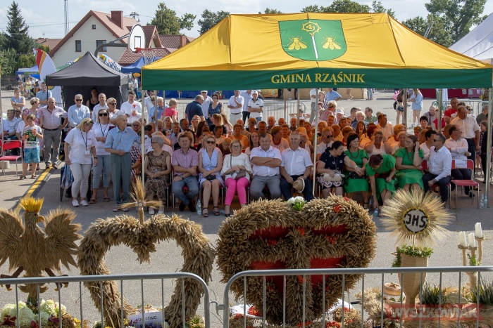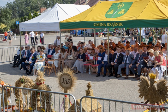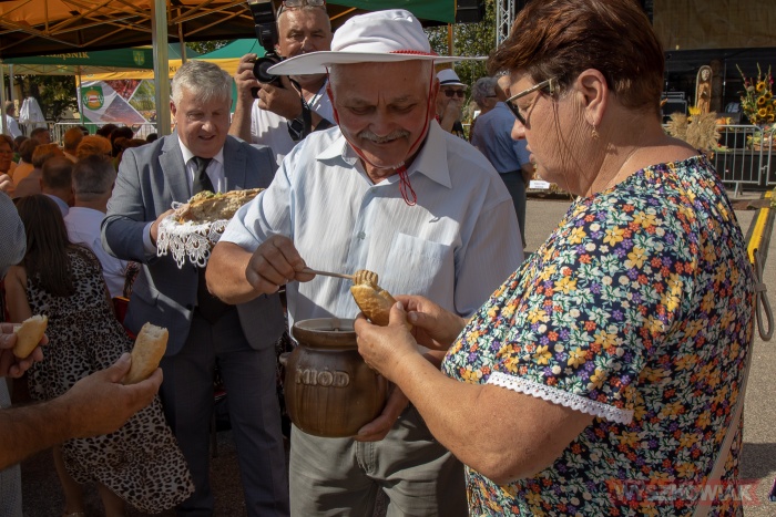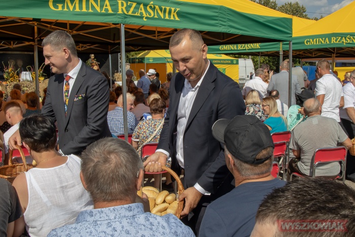 (Zam: 29.08.2022 r., godz. 14.23)Po uroczystej mszy odbyła się ceremonia przekazania chleba. Gospodarze uroczystości starosta Jerzy Żukowski i wójt gminy Rząśnik Paweł Kołodziejski odebrali bochen od starostów dożynek - Magdaleny Kołodziejskiej i Waldemara Chodyny oraz starosty bartnego delegowanego przez Powiatowe Koło Pszczelarzy w Wyszkowie Leszka Zwalińskiego. Następnie pozostali wójtowie i burmistrz podzielili się chlebem z uczestnikami wydarzenia.