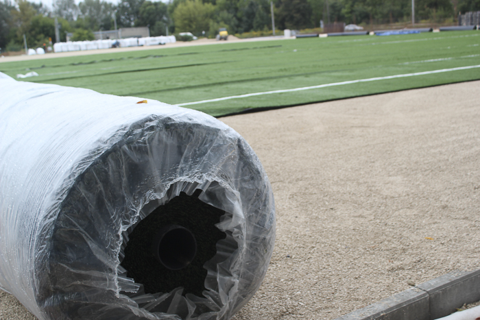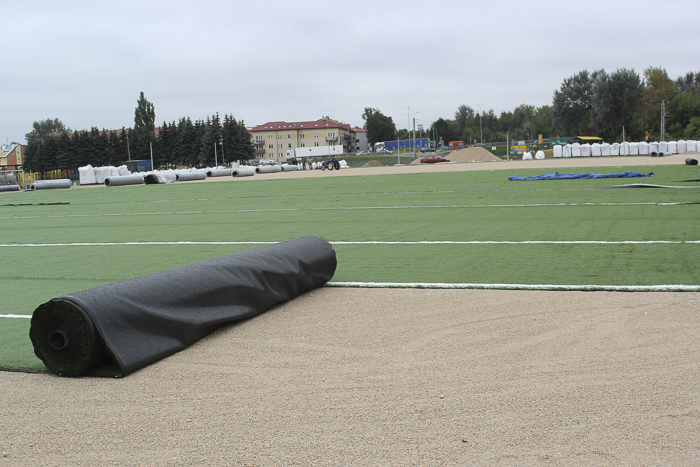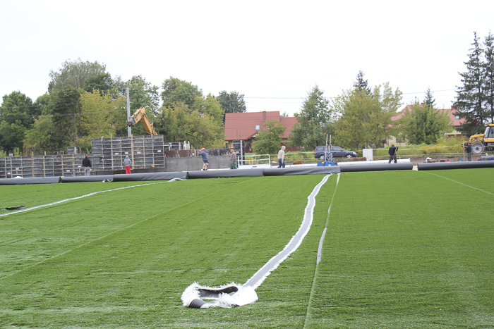 Wykonawca inwestycji przy ul. Kościuszki rozkłada sztuczną murawę. Trwa też budowa trybuny.