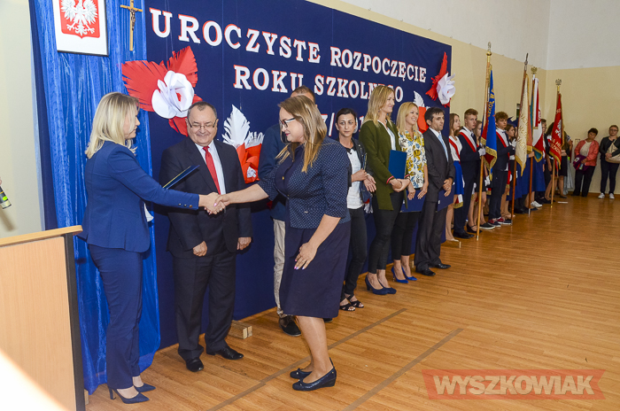 Podczas uroczystości zastępca burmistrza Aneta Kowalewska oraz naczelnik wydziału oświaty i spraw społecznych Urzędu Miejskiego Sławomir Cieślak pogratulowali nauczycielom, którzy uzyskali stopień nauczyciela mianowanego – Karolowi Wołynce, Kamilowi Gajewskiemu, Gabrieli Fidurze, Kindze Kajmie, Katarzynie Skoczeń, Milenie Rudnickiej.