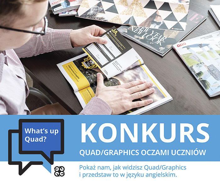 (Zam: 23.11.2017 r., godz. 15.46)„Quad/Graphics oczami uczniów” – to temat pierwszej odsłony konkursu adresowanego do uczniów szkół średnich i gimnazjalistów powiatu wyszkowskiego i okolic. Będą w nim mogły wziąć udział zespoły składające się z dwóch do czterech osób. Ich zadaniem będzie opracowanie konkursowego tematu, przy czym sposób jest dowolny. Mogą to zrobić za pomocą prezentacji multimedialnej, tekstu, filmu (także animacji poklatkowej), wywiadu, quizu, rysunku, fotostory lub łącząc kilka form. Najważniejsze jednak, by prace były przedstawione w języku angielskim. Później zespoły będą musiały o nich opowiedzieć przed komisją. Też po angielsku.